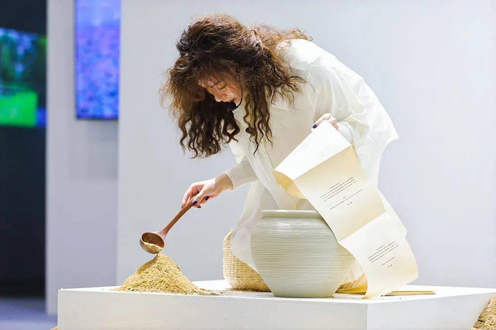 在表演中,一部由十三书构成的诗学宣言被以一种极其缓慢、克制专注的节奏朗读。这是一场将语言物质化的慢速劳动。宣言中以“我们”的口吻,化身为沙粒本身,讲述其源于星辰、栖息于身体,以地质学的方式记载记忆的宏大历史,每当一句宣言阅读结束,陶勺将舀起一勺沙,在圆形边界内堆积成一座缓慢隆起的小型沙丘。这个重复性的动作,将堆积这一看似徒劳的行为,升华为对抗时间流逝与维系存在本身的深刻劳动。