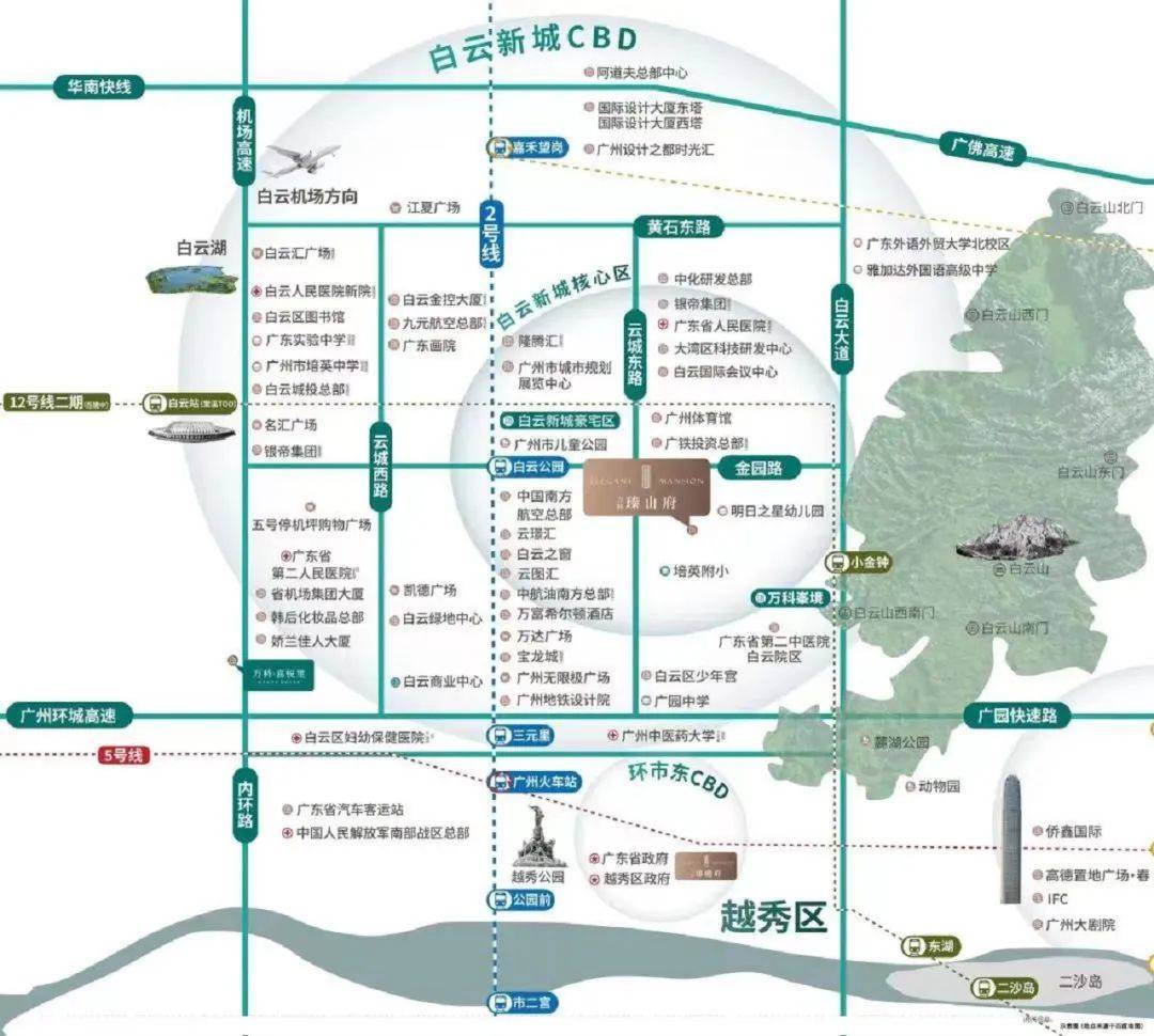 项目紧邻广州儿童中心、白云国际会议中心等六大省市级地标建筑,南航三大总部、无限极总部、地铁设计院总院等总部大楼环绕在旁,共同构筑了一个高端、商务、国际化的生活圈层。