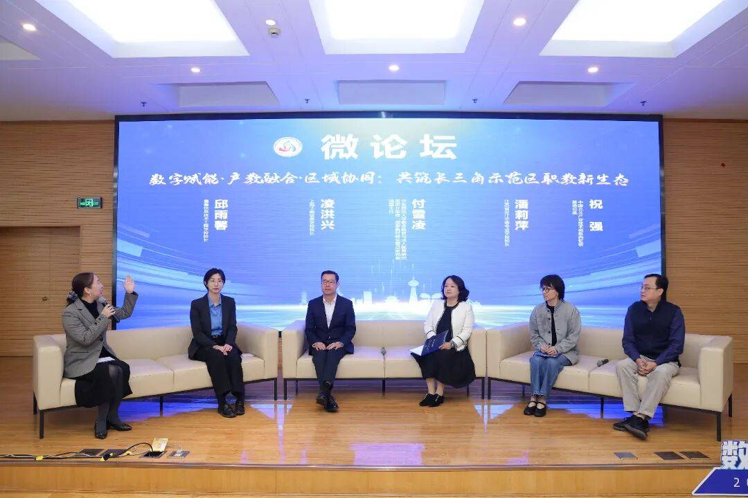 微论坛环节以“数字赋能·产教融合·区域协同:共筑长三角示范区职教新生态”为主题,邀请上海工商信息学校校长、江苏省吴江中等专业学校校长、嘉善信息技术工程学校校长、中国北斗产业技术创新西虹桥基地总裁、华东师范大学职业教育与成人教育研究所所长助理等五位嘉宾展开深度对话,从“数字冲击与职教应答”“产教融合的示范区实践”“面向未来的协同构想”三个篇章多维度探讨示范区职教发展的现实路径与未来愿景。